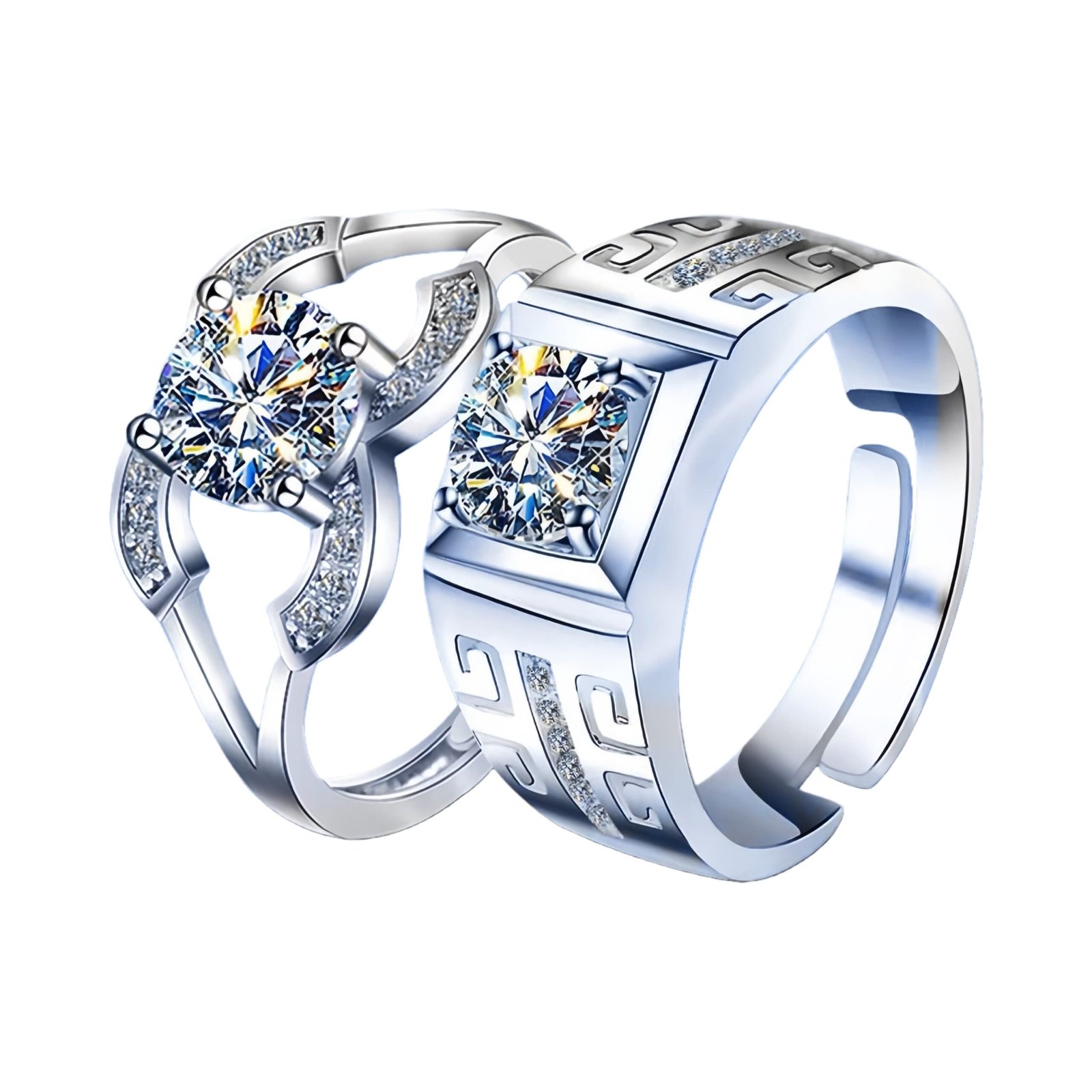 The women’s ring showcases a delicate open-heart cutout with a round center zircon and paved side stones, while the men’s ring features a bold square zircon framed by a retro Chinese key pattern, creating a harmonious yet distinct his-and-hers design. The open band construction ensures a comfortable, adjustable fit for most finger sizes, eliminating the hassle of precise size selection.